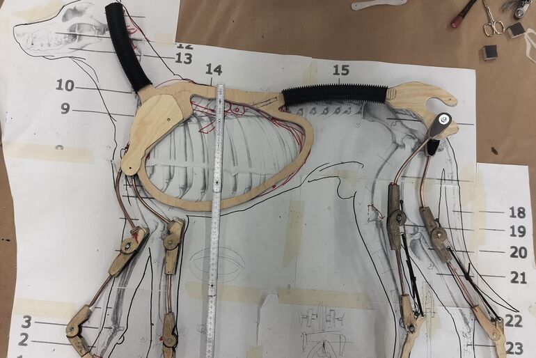 Ingo Mewes, Lehrkraft für Werkstattlehre und Spezialist für Puppen- und Bühnenbau, hat in Zusammenarbeit mit Jonathan Gentilhomme, Lehrkraft in der künstlerischen Werkstattlehre und Co-Leitung des Puppenfundus, eine Hunde-Puppe kreiert, die in ihrer Qualität und Spielbarkeit auf dem neuesten Stand der Puppenbau-Technik ist. Ziel ist es, einen Hund zu bauen, dessen Bewegungsqualitäten so nah wie möglich an der Realität sind. Der Hund wird im April 2026 im Hamburger SchauSpielHaus in Claudia Bauers Inszenierung von "Hundeherz" zum Einsatz kommen. Der HfS-Alumnus Oscar Olivo wird als Spieler in der Inszenierung die Vierfüßler-Puppe alleine zum Leben erwecken - eine zusätzliche Herausforderung für die Puppenbau-Experten der HfS Ernst Busch.